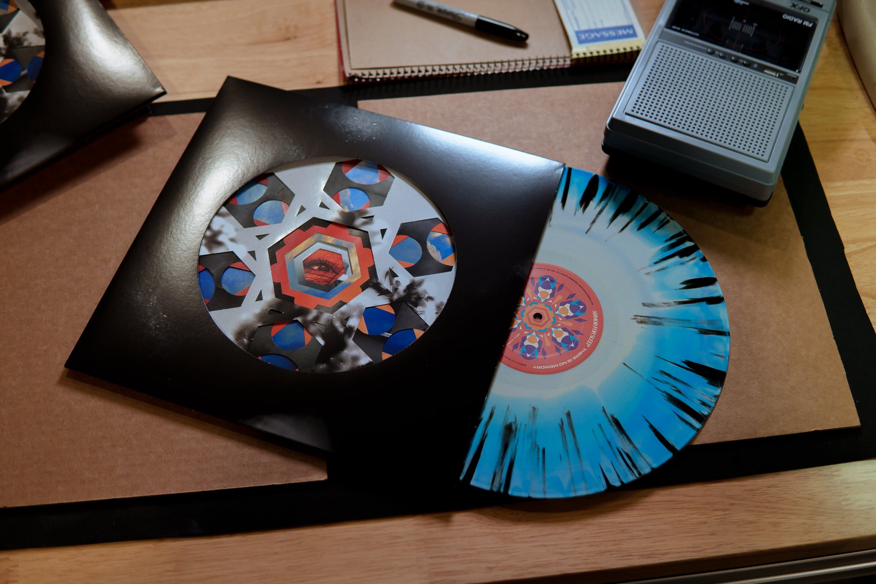 A limited edition Armor For Sleep vinyl with a blue and white splatter design is partially pulled from a black, geometric-art sleeve, resting on a desk next to a retro cassette recorder and stationery.