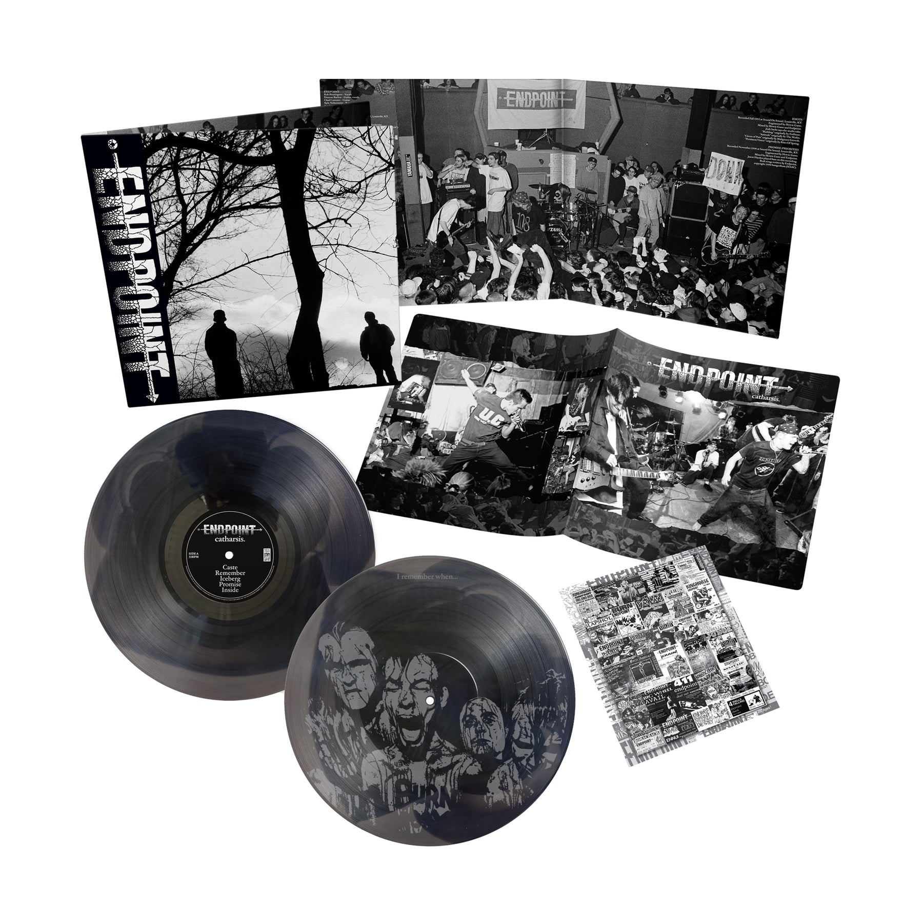 The Endpoint Catharsis Deluxe Edition vinyl box set by Endpoint includes two Black/Light Grey Ripple Vinyl LPs, a gatefold cover, group photo, lyric booklet, and collage inserts—exclusively available for album presale.