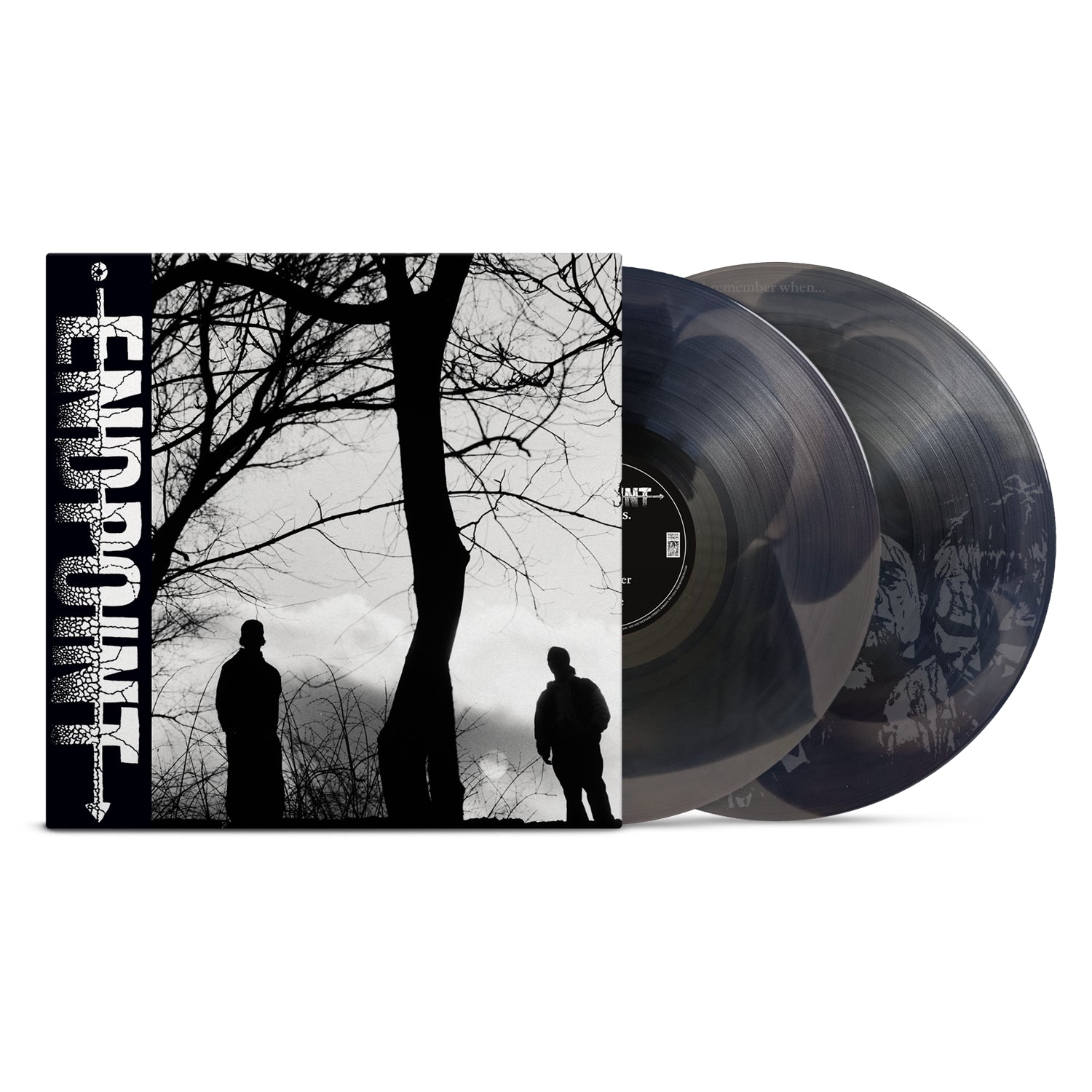The Endpoint Catharsis Deluxe Edition vinyl set features two Black/Light Grey Ripple LPs and cover art of two silhouetted figures by bare trees. Available now for album presale.